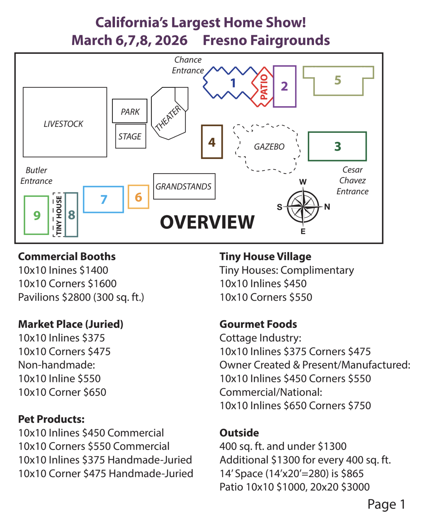 By clicking onto the floor Plan you will be able to see the layout of each building and outside spaces. The companies that are listed in the spaces are already signed up for the show and the spaces with only a booth number are the spaces that are available. Call Fresno Home Shows at 800-897-7899 if you have any questions or to reserve a booth.